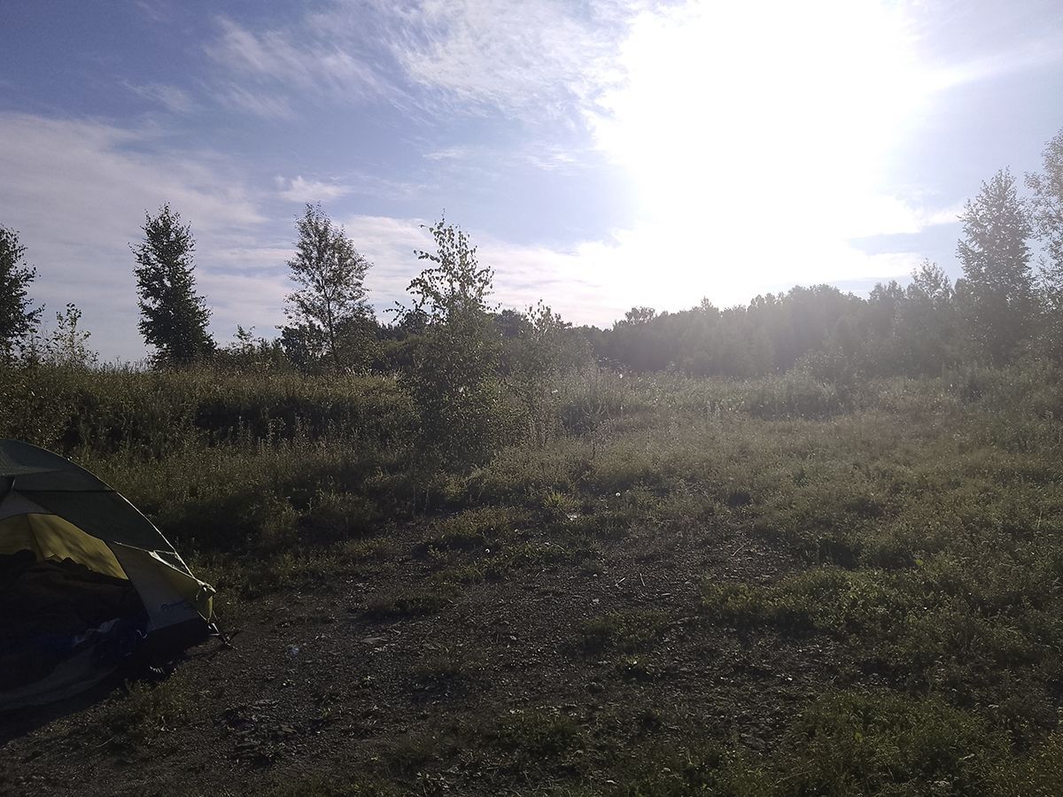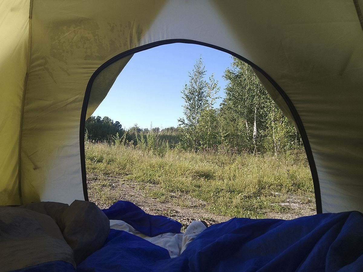 Умиротворяющий вид из проёма палатки увидели мы в семь утра. Солнце, зелень, голубизна. Только особого тепла пока нет, хотя значительно лучше, чем во время первого пробуждения, когда было всего +7.