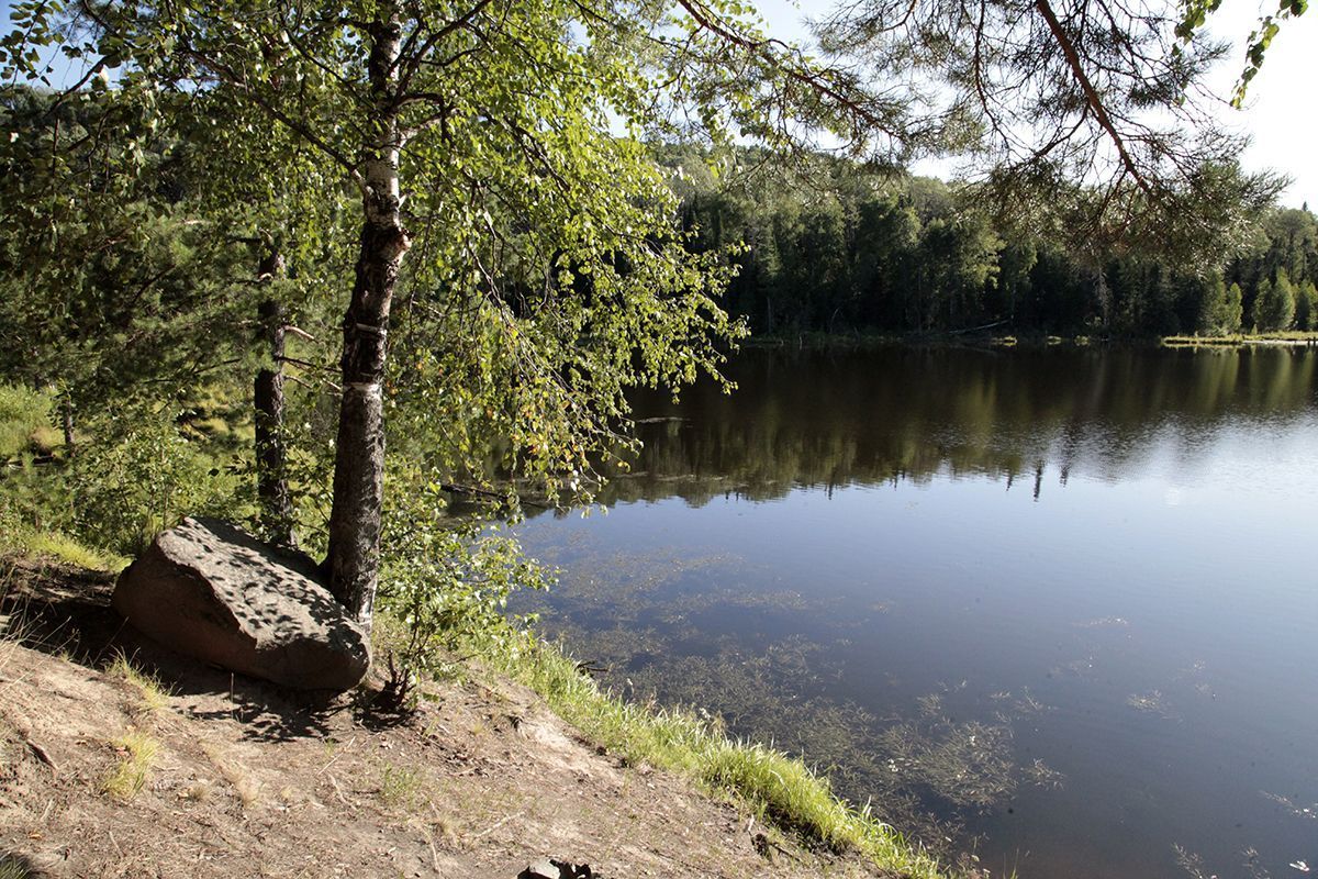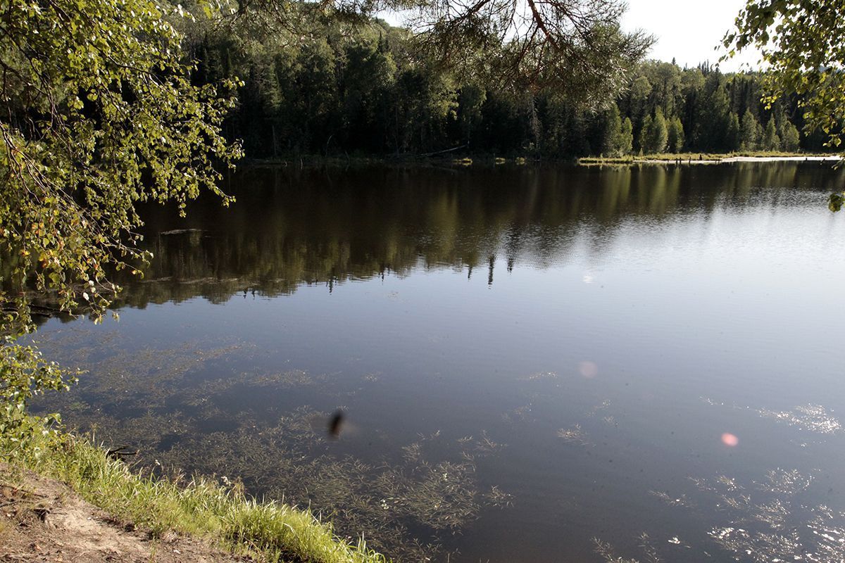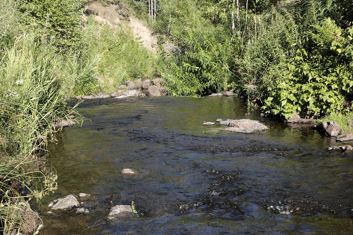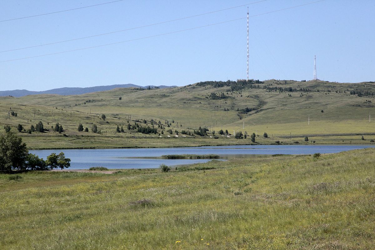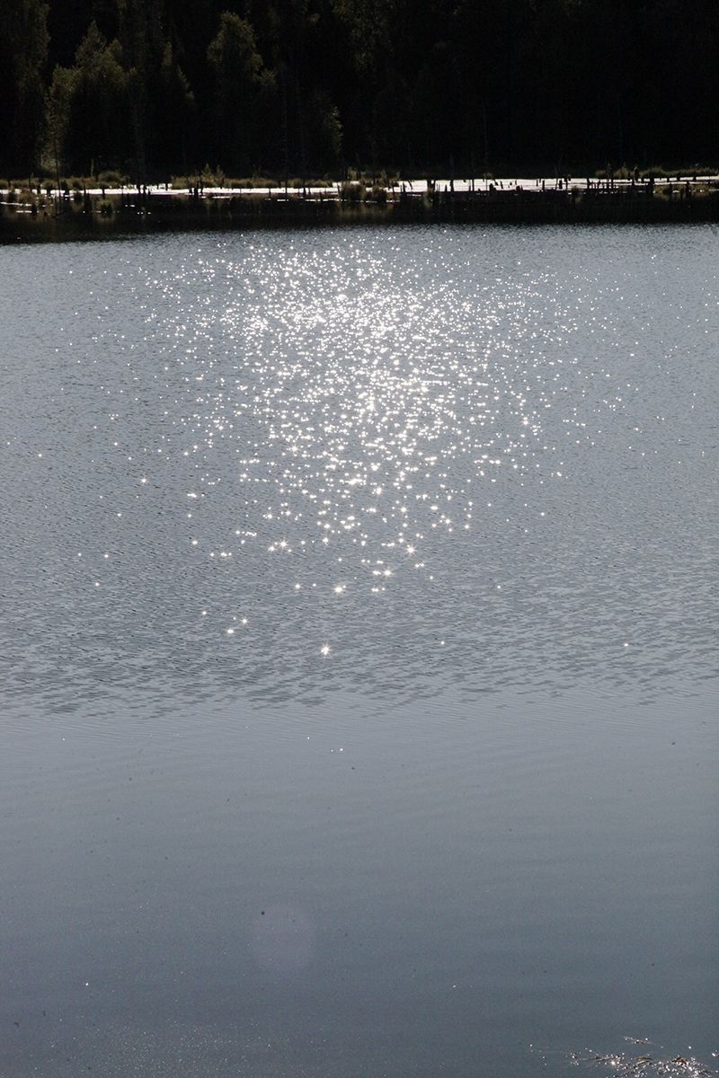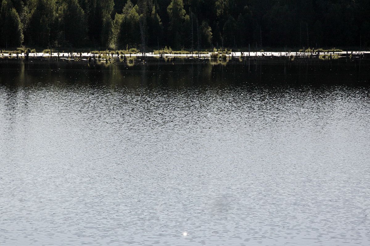 Поехали по подсказке и поняли, что попали в совершенно другое место. По крайней мере разрекламированного водопада не увидели, зато добрались до потрясающего озера, названия которого так и не нашли. Может это и есть бывшее водохранилище от некогда существовавшей здесь ГРЭС? Только поднимаясь к нему, мы шли навстречу вытекающей мелкой и бурной речушки, совсем узенькой, но тоже имеющей свой водопадик.