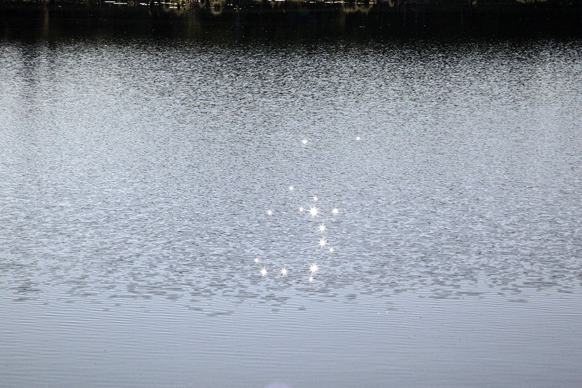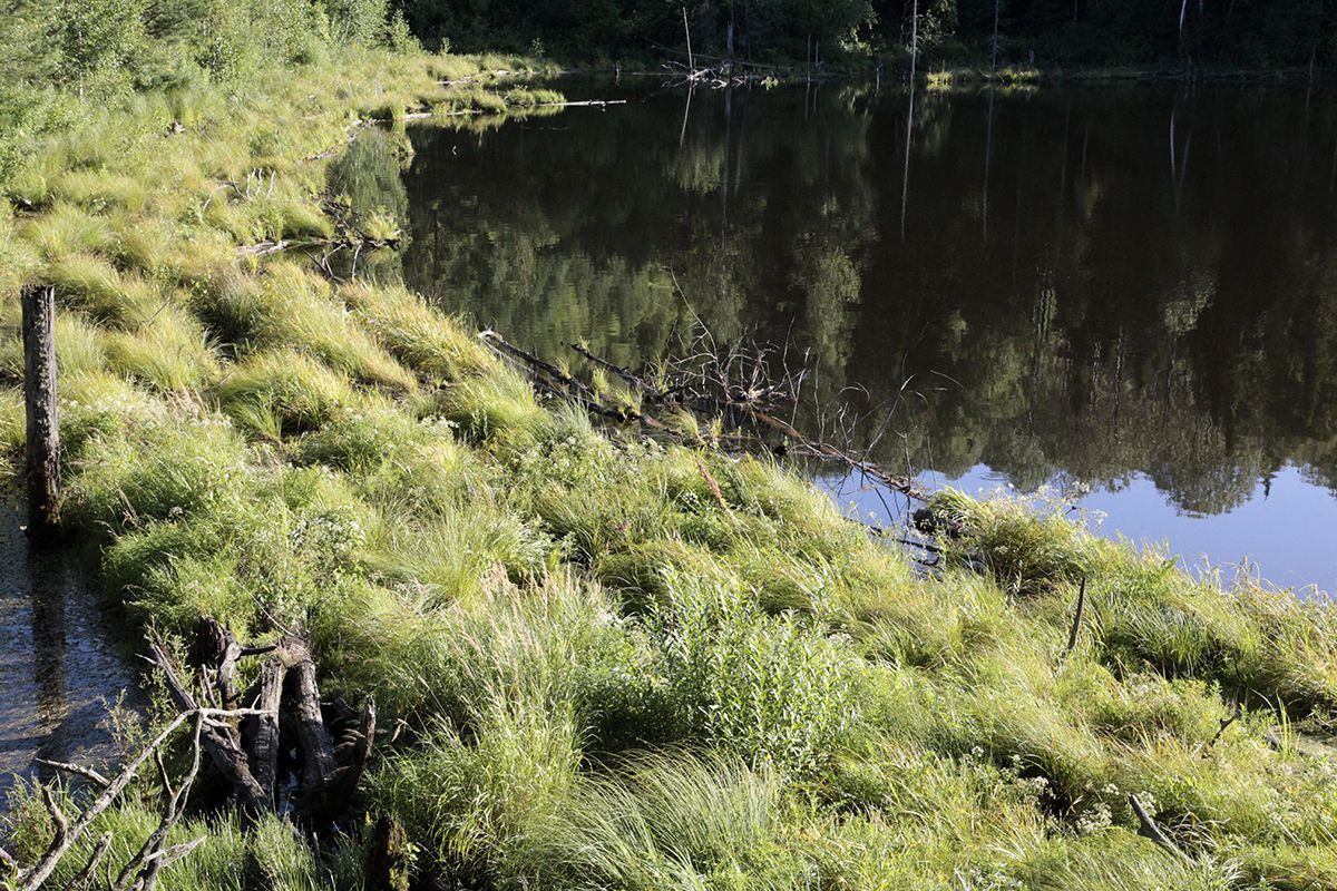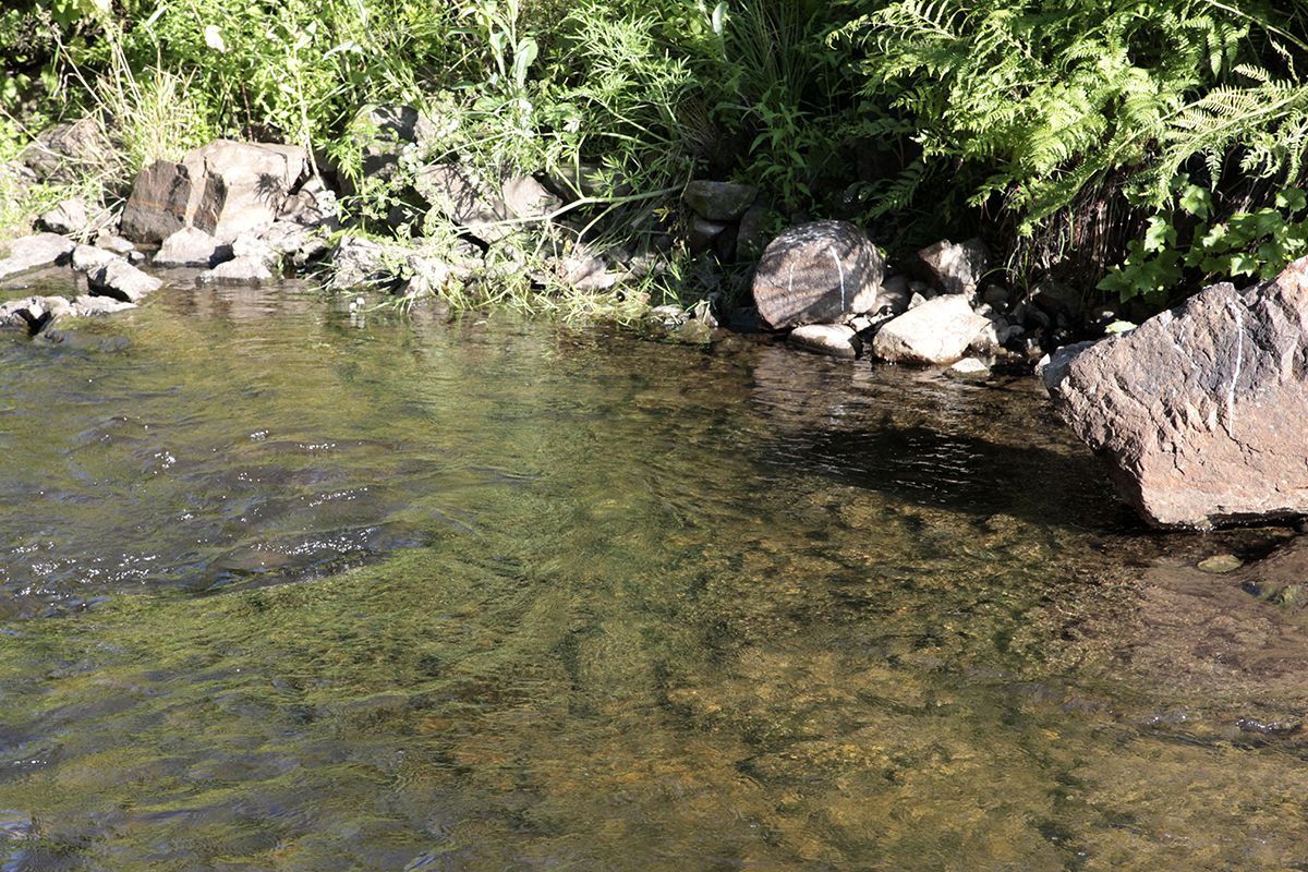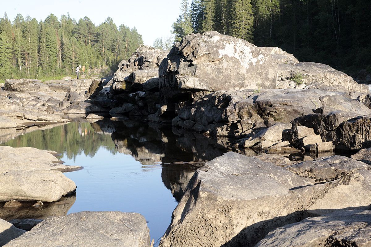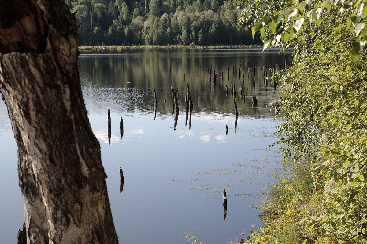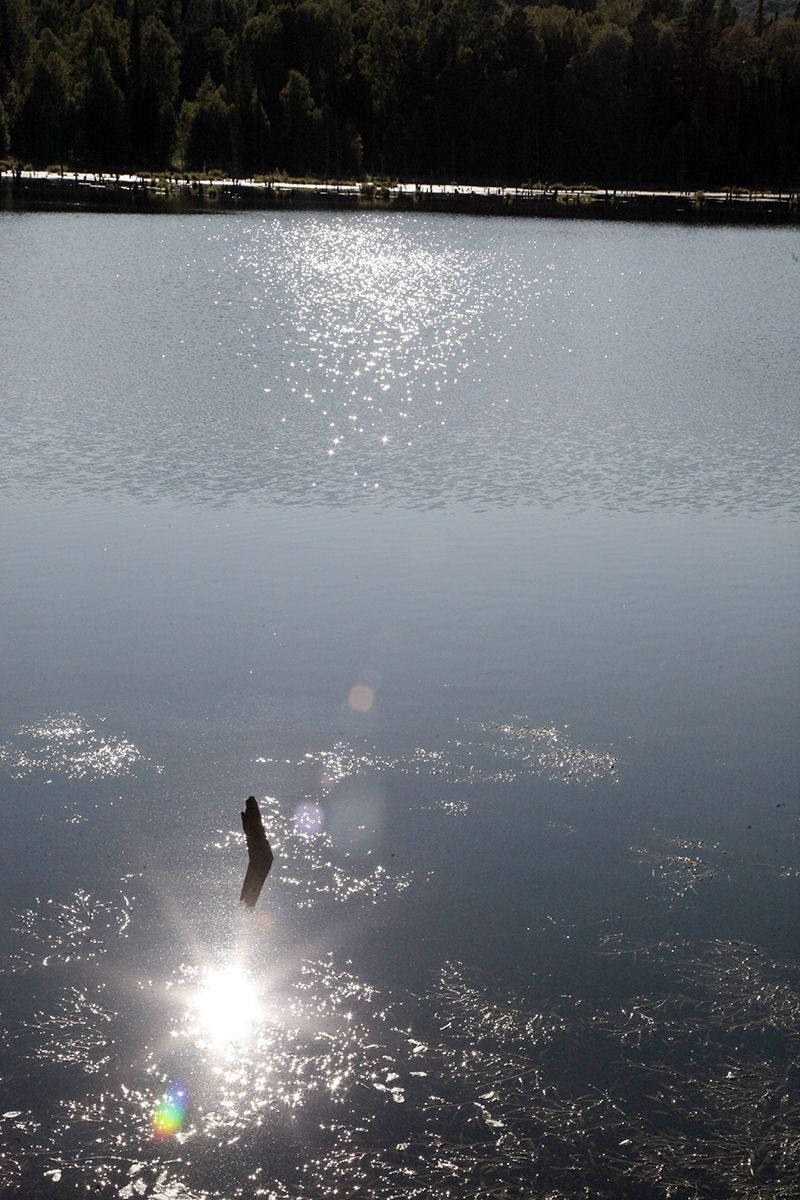Поехали по подсказке и поняли, что попали в совершенно другое место. По крайней мере разрекламированного водопада не увидели, зато добрались до потрясающего озера, названия которого так и не нашли. Может это и есть бывшее водохранилище от некогда существовавшей здесь ГРЭС? Только поднимаясь к нему, мы шли навстречу вытекающей мелкой и бурной речушки, совсем узенькой, но тоже имеющей свой водопадик.